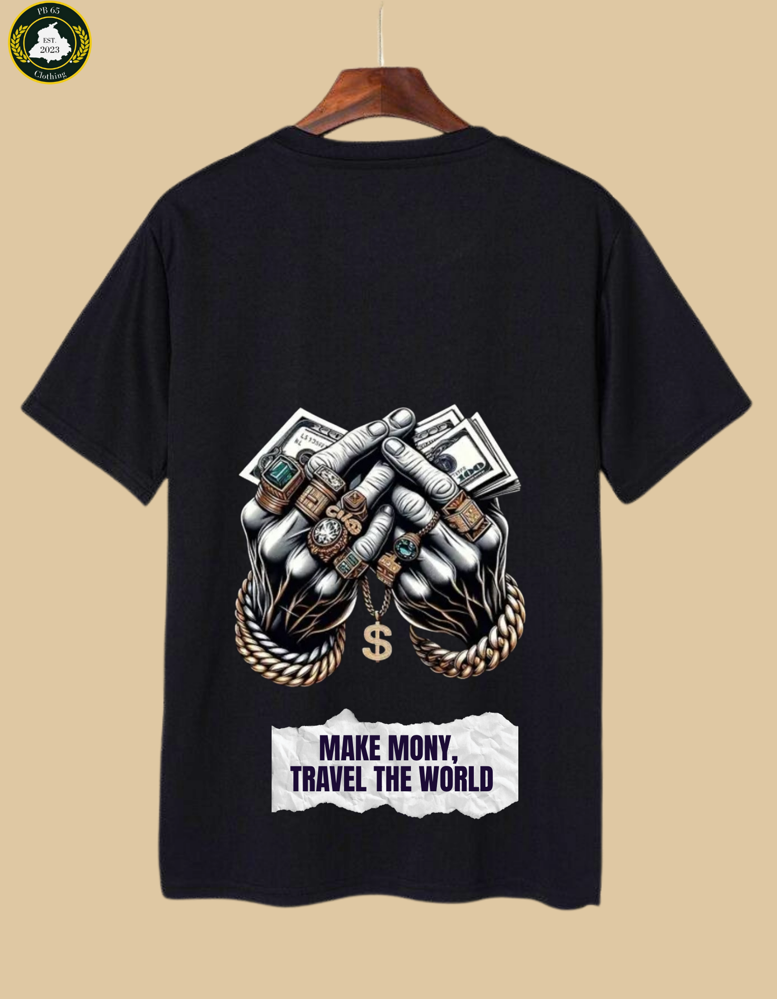 Live the dream with the PB65 Clothing “Make Money, Travel The World” t-shirt. Featuring a design that embodies wealth and travel, this comfortable 100% cotton tee is available in black.